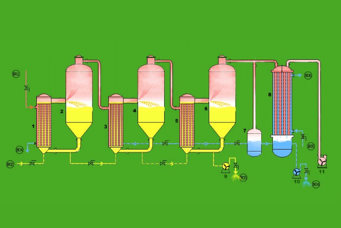 1 一效加热器 2 一效分离器 3 二效加热器 4 二效分离器 5 三效加热器 6 三效分离器 7 汽水分离器 8 冷凝器 9 出料泵 10 冷凝水泵 11